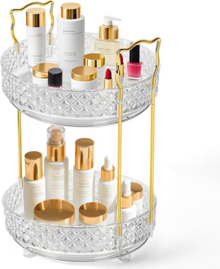 360 Rotating Makeup Organizer for Vanity, 2Tier Adjustable Perfume Organizer for Dresser, Multi-Function Spinning Cosmetics Skincare Storage for Bedroom, Dresser, Countertop, Clear