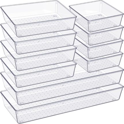 Criusia Drawer Organizer, 10 Pack Large Clear Plastic Set, 3 Size Versatile Bathroom and Vanity Organizer Trays, Storage Bins for Makeup, Bedroom, Kitchen Utensils