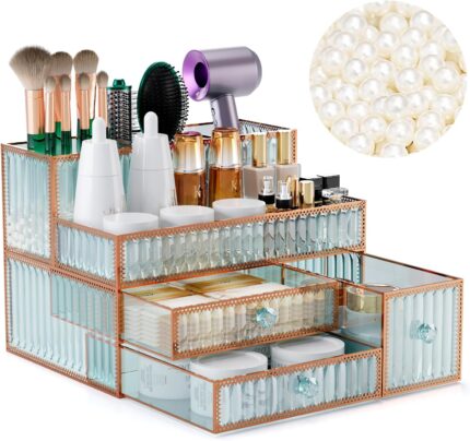 Makeup Organizer Countertop – Tempered Glass Vanity Organizer for Cosmetics, Skincare, Hair Tools, Brushes, Perfume – Multipurpose Bathroom Counter Skincare Organizer