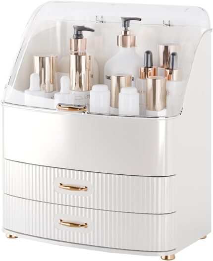 Makeup Organizer Countertop Vanity with Transparent Lid Drawers Waterproof Dustproof Cosmetic Skincare Bathroom Storage Gift for Women Teens Girls (Whtie)