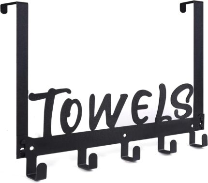 Over The Door Hook, Towel Holder Towel Hook for Bathroom, Towel Hanger Door Rack with 5 Coat Hooks, Over The Door Hanger Towel Rack for Bathroom, Bedroom Towels Coats, Black