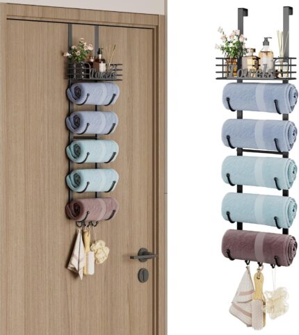 Over The Door Towel Racks for Bathroom,6 Tier Towel Rack Wall Mounted with Metal Shelf and Hooks,Rolled Towel Storage for Bathroom Door Holder Organizer Hanging,Black