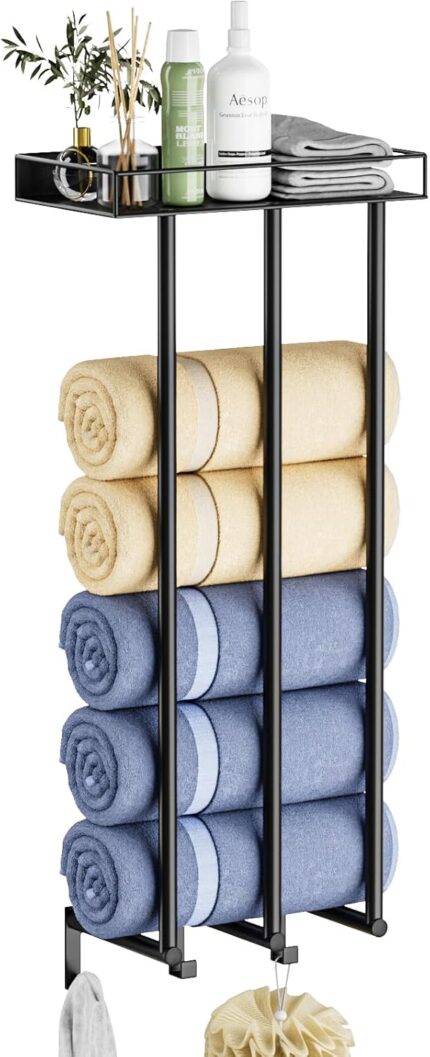 Ovicar Towel Racks for Bathroom – Wall Mounted Rolled Towels Storage with Metal Shelf & 3 Hooks,3 Bars Wall Towel Holder for Small Bathroom, Bath Towel Organizer Black