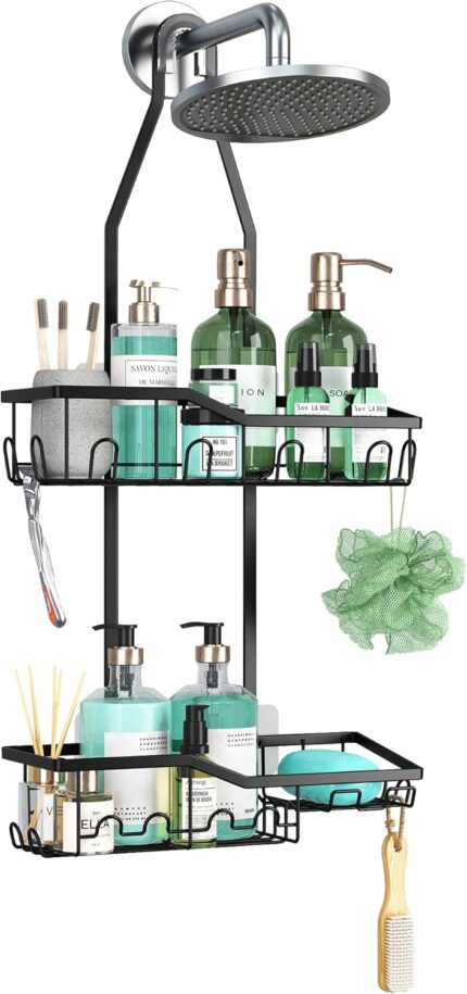 Shower Caddy Hanging Organizer, Rustproof Over Shower Head Caddy Holder with Hooks for Razor/Sponge, No Drilling Bathroom Racks Bath Storage Shelves for Shampoo Soap Towels, Black