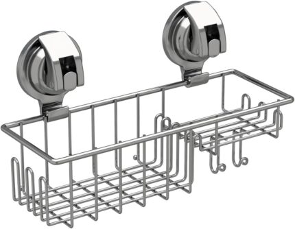 Suction Cup Shower Caddy, Shower Shelf Soap Dish with Hooks for Razor, Sponge, Rust Proof 304 Stainless Steel, Silver