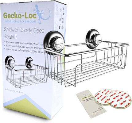 Gecko-Loc Large Deep suction cup wall mount bathroom shower caddy – shampoo storage basket shelf organizer caddie bath shelves – Silver