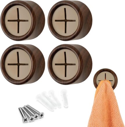 S&T INC. Round Adhesive Push Towel Hooks for Kitchen, Hand and Dish Towels, Plastic, Walnut, 4 Pack