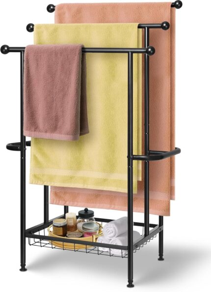 Haturi Free Standing Towel Rack for Bathroom, 39″ Black 3-Tier Rust-Resistant Outdoor Towel Drying Rack for Pool, Metal Blanket Rack Holder with Storage Basket for Oversized Bath Towels