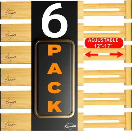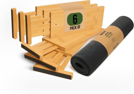 Adjustable Bamboo Drawer Dividers 6 Pack, Expandable Drawer Organizer for Kitchen, Bedroom, Bathroom and Dresser, Each Divider Expands from 12″ to 17.5″ Height 4.5 – Free Mat Included in Package.