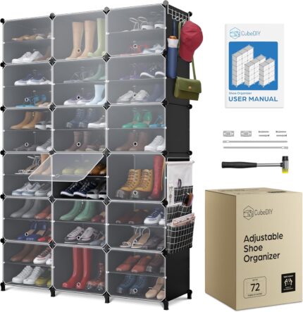 Shoe Organizer Cabinet Up to 72 Pairs, Shoe Closet-Covered Shoe Rack with See-Through Door (Clear, Plastic, Stackable) Cubby Portable Shoe Organizer with Covers, Hooks & Pockets, Black