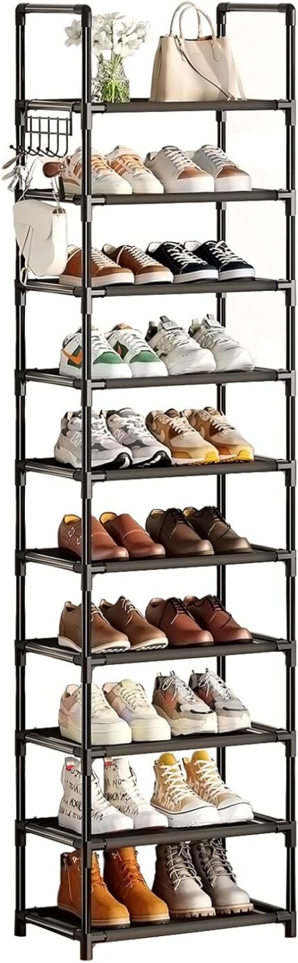 Simple Trending Shoe Rack for Closet, 10 Tiers Narrow Shoe Shelf Holds 20 Pairs, Shoe Organizer Storage with Hooks, Black
