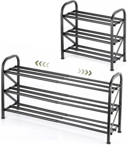3-Tier Expandable Shoe Rack, Adjustable Shoe Shelf Storage Organizer Heavy Duty Metal Free Standing Shoe Rack for Entryway Closet Doorway (Black)