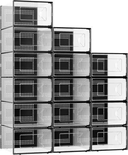 X-Large Shoe Storage Box, 15 Pack Clear Plastic Stackable Shoe Organizer for Closet, Interlocking Design Shoe Container Bins for Sneakers, Foldable Shoe Rack with Lids, Black