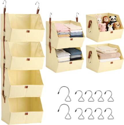 4-Tier Hanging Closet Organizer, Space-saving Wardrobe Storage Bins with Hooks, Foldable Fabric Hanging Shelves, Disassemblable Closet Organizer System for Bedroom, Dorm, RV