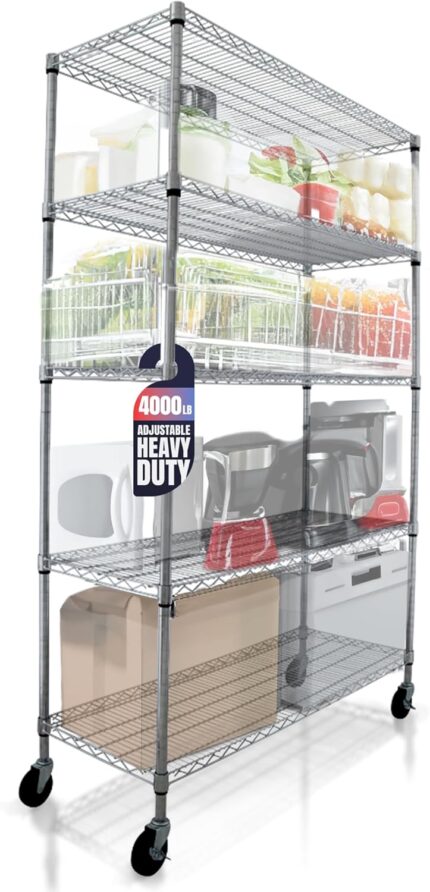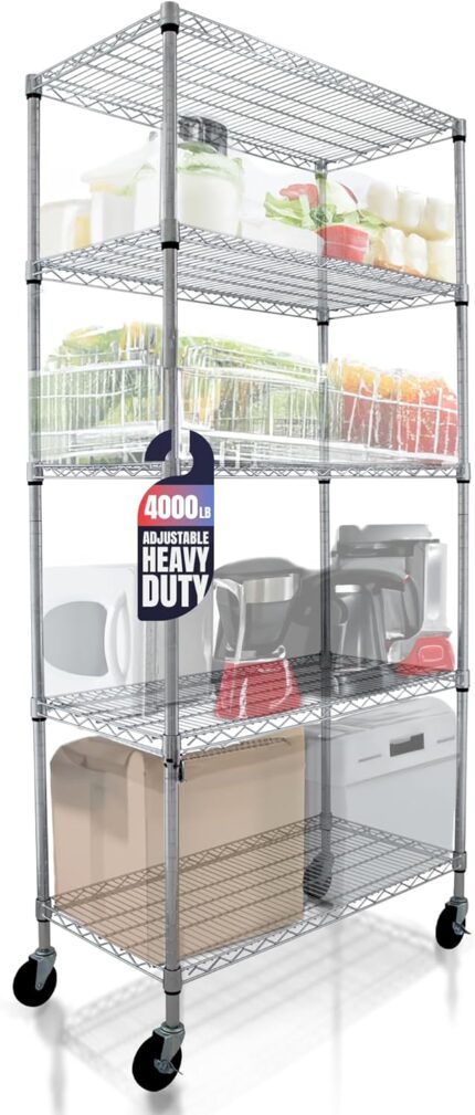 4000 LBS Heavy Duty Metal Shelving Unit – 36x18x76 NSF 5-Tier Wire Rack with Wheels, Adjustable Garage Storage Shelves, Chrome Wire Shelving for Kitchen, Warehouse, Bakers Rack – Crescent
