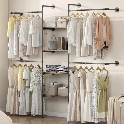 Industrial Pipe Clothing Rack – Heavy Duty Wall Mounted Clothes Rack, Corner Closet System, DIY Wardrobe Organizer with Shelves, Walk in Closet Storage (BLACK, 94.5″)
