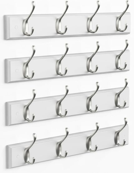Forbena White Coat Rack Wall Mount 4-Pack, Coat Hanger Wall Mounted for Hanging Clothes Purse, Modern Key Holder Hooks for Closet Hat, Belt, Bag, Backpack, Leash (White and Silver – 16 Hooks)