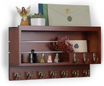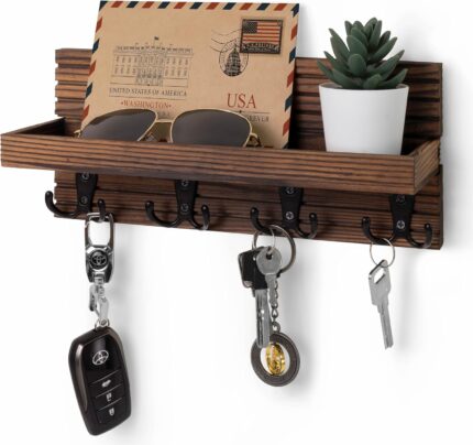 Natural Wooden Key Holder – Wall Mounted Mail Organizer and Key Hanger – Rustic Farmhouse Entryway Shelf with 4 Double Hooks – Decorative Rack for Car Keys, Wallet (Dark Brown)