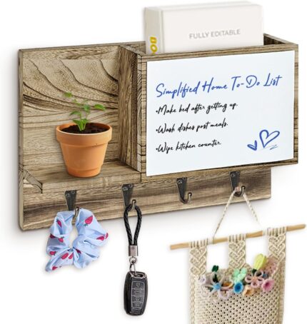 Rustic Wall Mounted Mail and Key Holder, Brown Solid Wood with Magnetic Whiteboard, 4 Hooks, Entryway Organizer