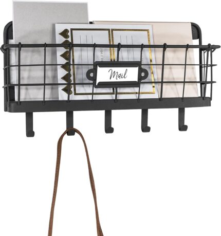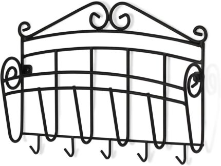 Spectrum Scroll Wall-Mounted Mail Organizer With Key Hooks, Wall Mount Entryway Organizer for Mail & Keys, Wall Letter Holder for Home & Office Organization, Black