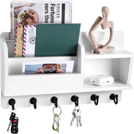 Key Holder Wall Mount, Key and Mail Holder for Wall with 6 Key Hook and Double Shelf, Mail Organizer Wall Mounted with 3-Tier Sortable Mail Slots, Key Rack for Entryway and Home Decor (White)