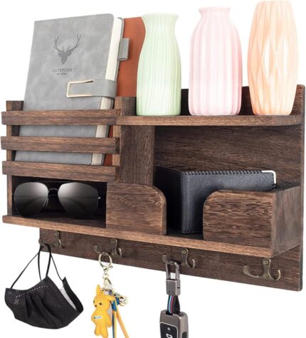 Key Holder Wall Mount, Entryway Mail Organizer with Shelf, Decorative Key Hanger with 7 Hooks Holds Leashes and Glasses, Includes Mounting Hardware (13.8” x 5.3” x 3.2”)
