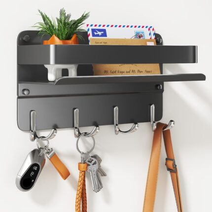 Key Holder Wall Mount Adhesive Magnetic – Hanging Key Hooks with Mail Organizer for Wallet House Accessories – Keys Hanger Rack with Shelf for RV Camper Entryway Door Home Living Room Decor Black
