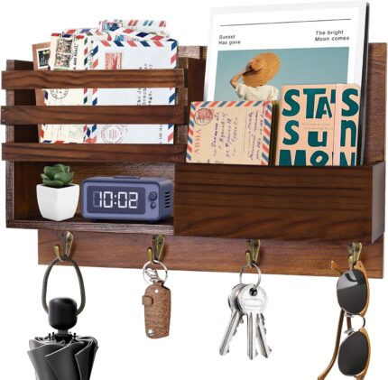 Key Holder Wall Mount, Mail Organizer with Key Hooks, Solid Wood Mail Holder with Hook Rustic Home Decor for Command Center Entryway Mudroom Hallway Doorway