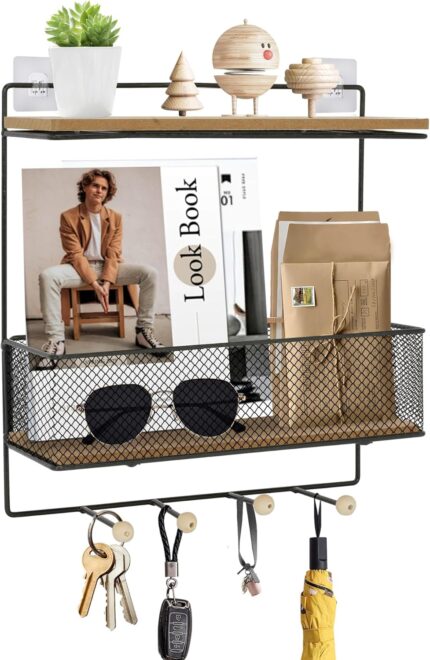 Key Holder Wall Mount, Self Adhesive Wall Organizer Key and Mail Holder Includes 4 Key Hooks, Mail Organizer Tray, Wooden Shelf for Entryway, Hallway, Kitchen, Living Room, Office