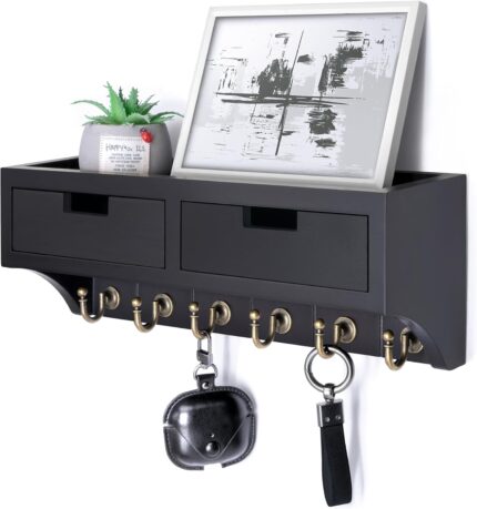 Rebee Vision Key Holder Wall Mount with 2 Drawer Organizer : Decorative Mail Organizer with 6 Key Hooks & Small Wall Shelf – Modern Home Decor for Apartment Essentials (Black)
