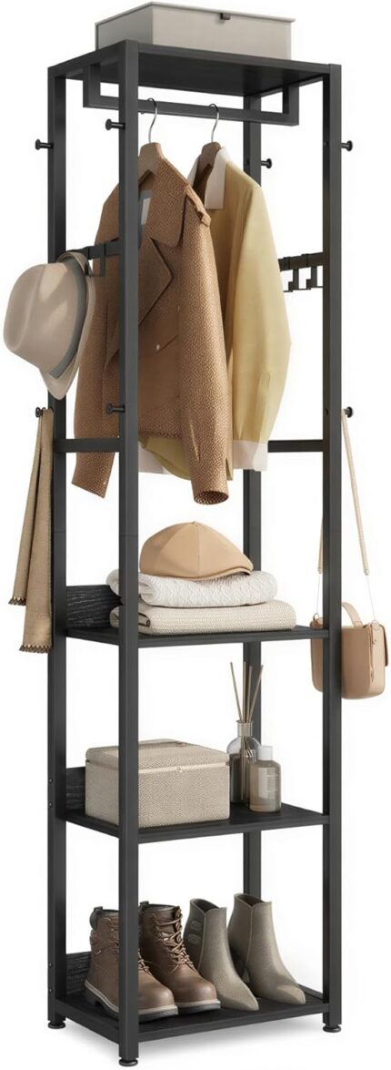 VASAGLE Coat Rack, Freestanding Hall Tree with Shelves, Hanging Rail, and Hooks, Space-Saving Coat Stand, Steel Frame, for Clothing, Bags, Hats, Ink Black and Charcoal Gray URCR061BD03