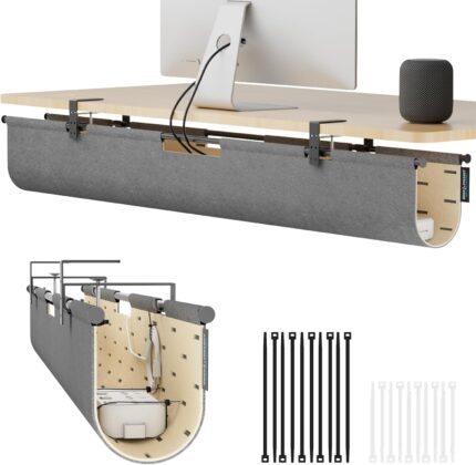 2-in-1 Under Desk Cable Management Tray & Privacy Panel, Dual-Sided Felt Cord Organizer to Hide Wires and Clutter, Desk Mount Cord Holder for Office and Home, Clamp or Screw Mount (Gray/Khaki, 45.3″)