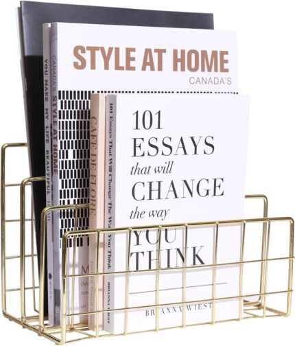 Metal File Organizer, 3 Vertical Sections, Desktop Paper/Mail/Letter/Record Holder, File Folder Holder Stand Rack Sorter for Office Desk Organization and accessories & supplies (Gold)