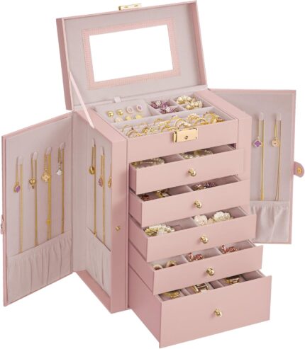 SONGMICS 6-Layer Jewelry Box Organizer with 5 Drawers, Jewelry Storage Case with Lock and Mirror, Large Storage Capacity, Gift for Loved Ones, for Necklaces, Watches, Jelly Pink UJBC152SA02S