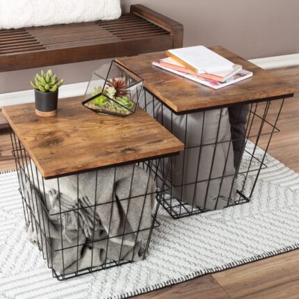 End Tables Set of 2 – Nesting Tables with Removable Wood Tops and Metal Basket Bases for Blanket Storage – Square Side Furniture for Living Room, Bedroom, or Home Office by Lavish Home (Brown)