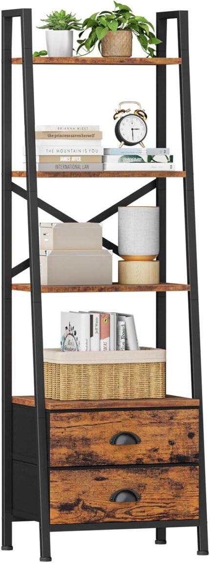 Furologee 4-Tier Ladder Shelf,Small Bookshelf with 2 Drawers,Vertical Bookcase Storage Rack Organizer,Rustic Bookshelves for Living Room,Bedroom,Bathroom,Home Office,Kitchen,Rustic Brown