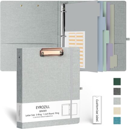 EYROZILL 3 Ring Binder, 1 Inch Linen Binder Organizer for Letter Size (8.5″ x 11″) with 5 Tab Dividers, File Folder Labels and Low Profile Clipboards, School and Office Supplies-Light Grey
