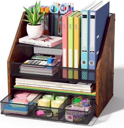 Wooden Desk Organizer – Mesh File Organizer with Drawers and Pen Holder – 4-Tier Vertical Paper Letter Storage Tray, Desktop Organizers and Accessories for Home Office