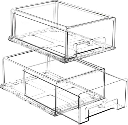 2 Pack Stackable Storage Drawers – Clear Refrigerator Drawers for Refrigerator Organizers and Storage, Acrylic Fridge Drawer Organizer with Handles for Bathroom, Undersink, Cabinet, Pantry, etc