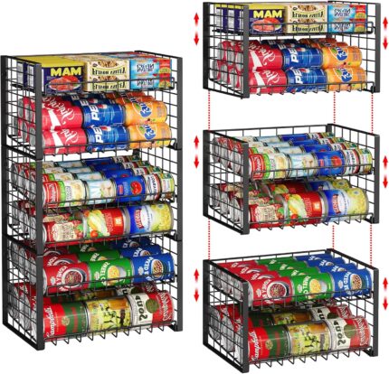 3-Pack Stackable Can Rack Organizer for Pantry, Adjustable Can Holder for Various Ounce of Cans up to 90, Rolling Can Dispenser for Canned Food Soup Goods Storage in Kitchen Cabniet, 2 Tier, Black