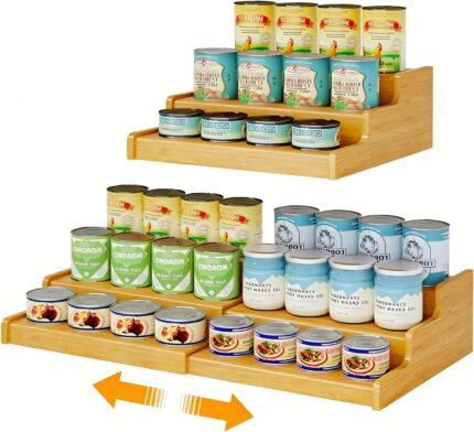 Expandable Bamboo Can Storage Display for Pantry, Easy-Access 3-Tier Adjustable Can Organizer Shelf for Cabinets, Canned Goods & Food Storage, Soda Can Organizer Holds Up to 24 Cans (Patent Pending)