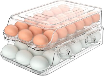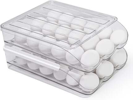 Egg Holder for Fridge, Automatically Rolling Egg Storage Container for Refrigerator,Large Capacity Egg Organizer for Fridge with Lid,Clear Plastic Dispenser, Tray & Bin -2 Layer