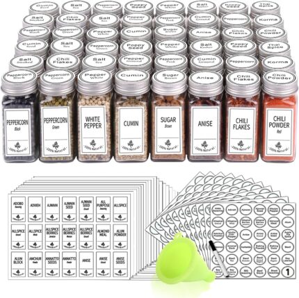 SWOMMOLY 48 Glass Spice Jars with 713 Spice Labels, Chalk Marker and Funnel Complete Set. 48 Square Glass Jars 4OZ, Airtight Cap, Pour/sift Shaker Lid
