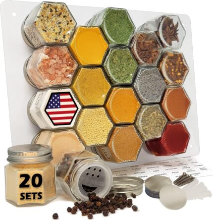 Magnetic Empty Small Hexagon Glass Spice Jars 20 Sets With Lids, Shaker, Board, Labels – DIY Spice Tins/Rack for Refrigerator, Fridge, Cabinet, Wall Mount