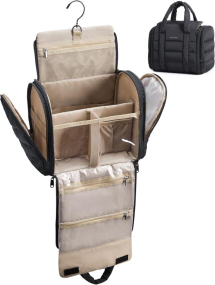 BAGSMART Travel Toiletry Bag with Removable Partition, Puffy Water-resistant Fabric Hanging Organizer for Full-Size Toiletries, Accessories, Black