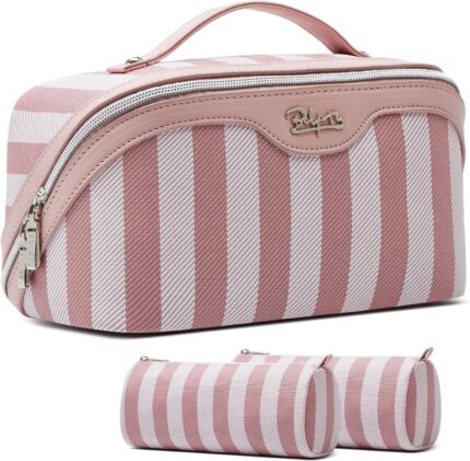 BOYATU Travel Makeup Bag for Women: Large Cosmetic Bag Set of 3 – PU Leather Make up Bag with Compartments – Compact Waterproof Toiletry Bag with Divider & Handle (B-1-Pink)