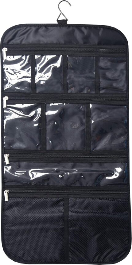 Goloni Hanging Toiletry Bag with Hook, Large Makeup Bag Travel Organizer, Water-Resistant Hanging Cosmetic Bag with 10 Compartments for Women & Men,Black