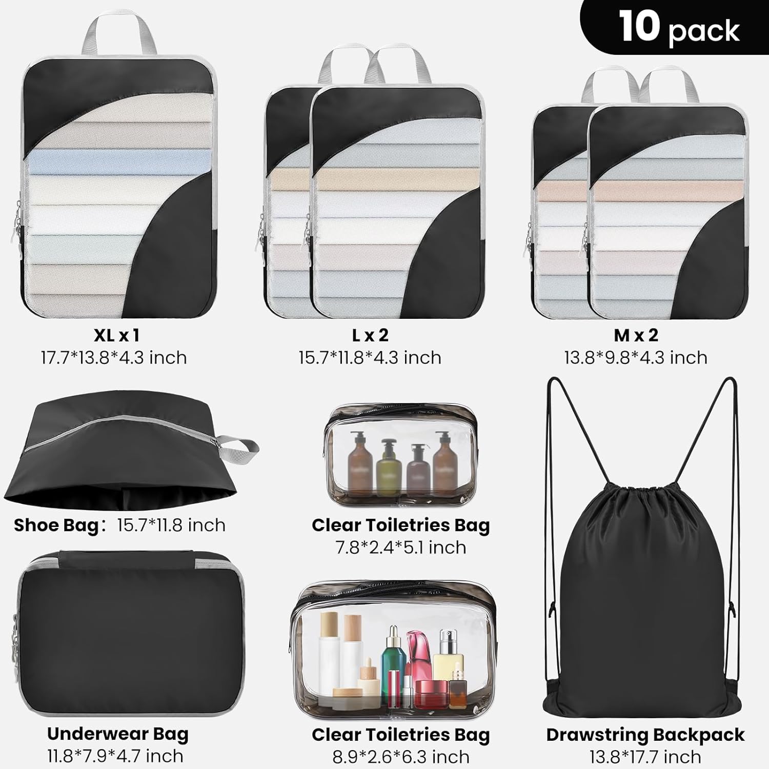What Will You Get: 10 set compression packing cubes for travel include 1 extra large cube cubes (17.7”x13.8”x4.3”), 2 large cubes (15.7’x11.8”x4.3”), 2 medium cubes (13.8″x9.8″x4.3″), 1 shoe bag (15.7″x11.8″), 1 drawstring backpack (13.8″x17.7″), 1 underwear bag (15.7″x19.6x”4″), 1 large clear toiletries bag (8.9″x6.3″x2.6″), 1 medium clear toiletries bag (8.9″x6.3″x2.6″), storage bags of various sizes can be used to pack clothes, pants, socks, shoes, cosmetics, etc., say goodbye to messy luggage and wardrobes, and keep your clothes neat and tidy