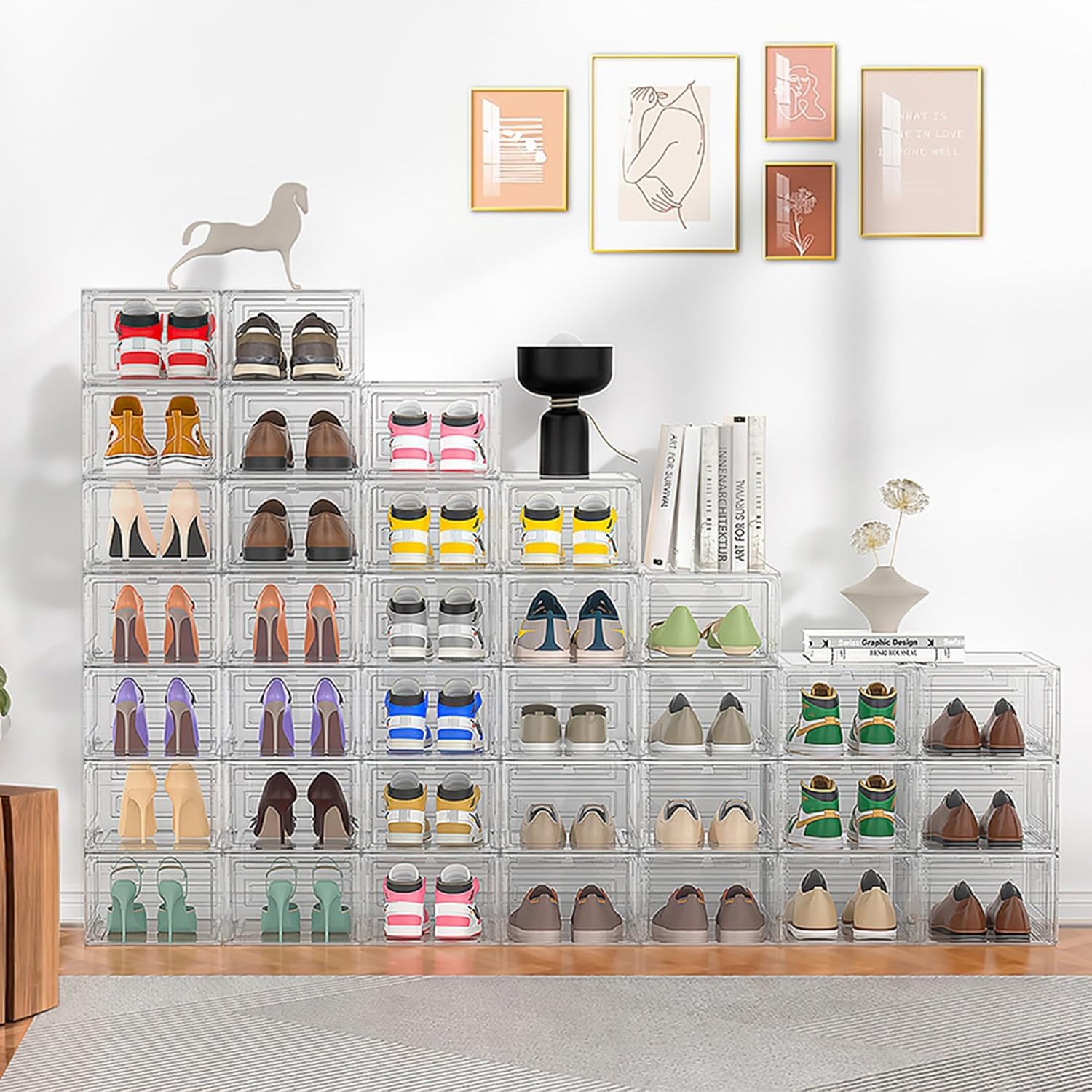 Upgraded Hard Shoe Boxes:Say goodbye to soft plastic shoe boxes! Crafted from sturdy hard plastic on all six sides, our shoe boxes boast exceptional durability and load-bearing capacity. Additionally, their transparent design ensures easy viewing of your entire footwear collection.