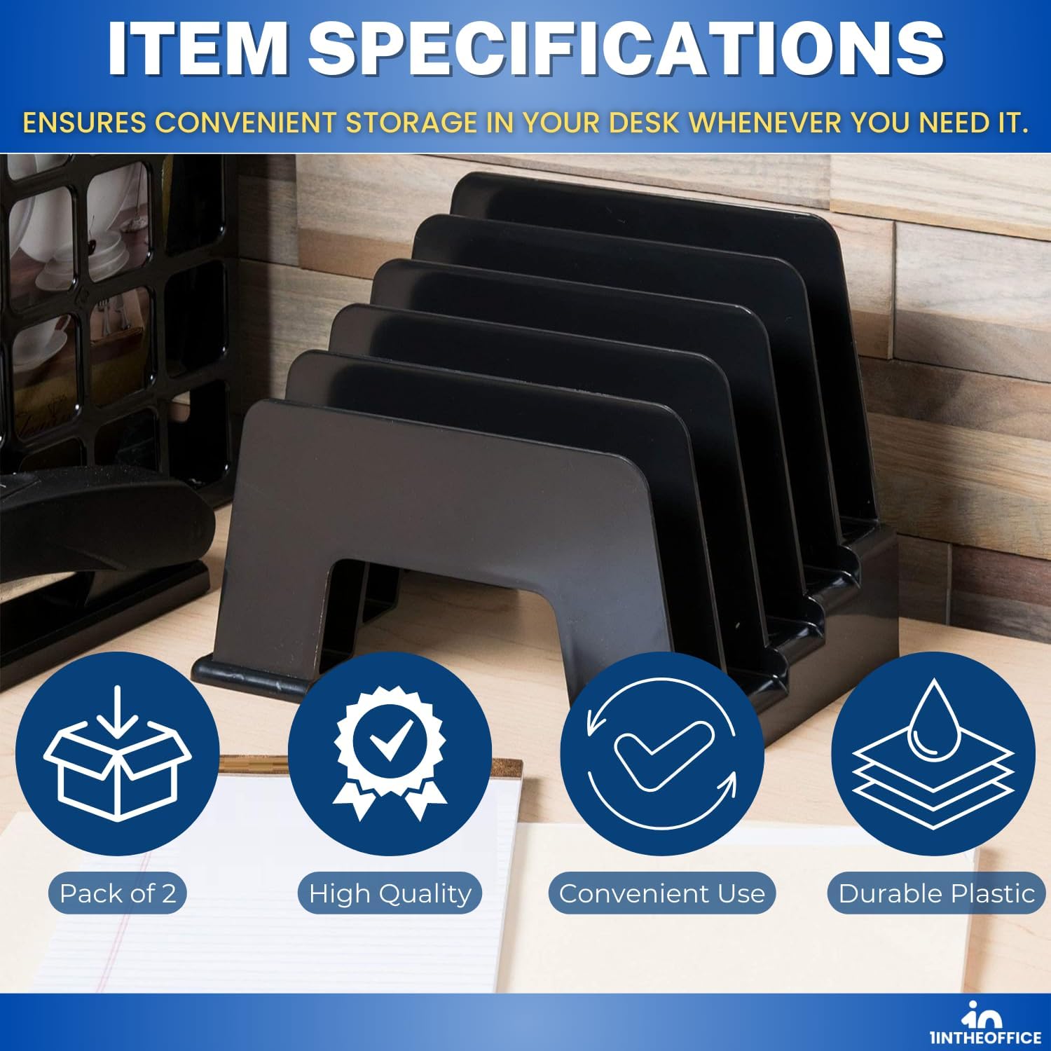 5 Tiered Compartments: Offers five ascending compartments that allow for easy viewing and access to your most important files, folders, mail, and documents. Ideal for prioritizing documents by urgency, category, or project.Space-Saving Inclined Design: The angled configuration not only enhances visibility and reachability but also minimizes the footprint on your desk, keeping essential paperwork within arm’s reach without overcrowding your workspace.Durable Plastic Construction: Crafted from high-quality, impact-resistant plastic, this file sorter is built to withstand daily use while maintaining a professional appearance. The solid black finish adds a touch of modern minimalism to any office or home setup.Non-Slip Base: Equipped with rubberized feet or a textured base to prevent slipping and protect your desk surface from scratches and scuffs.Versatile Functionality: Accommodates letter-sized documents, file folders, notebooks, brochures, and more. Perfect for use in offices, classrooms, home workspaces, or reception areas.Easy to Clean: Smooth plastic surface allows for quick cleaning with a damp cloth, keeping your workspace neat and hygienic.